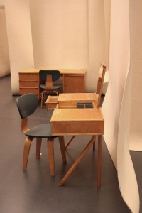 Dit zie je ook heel erg in de tentoonstelling terug. Qua indeling is er geen duidelijke structuur of route, maar is er juist voor een soort doolhof van gangen en kamertjes gekozen, waar achter elke opening en doorkijkje een juweeltje van een Pastoe meubel verborgen is. Met een klein informatief foldertje, loop je door de kamers en kom je oude en nieuwe topstukken tegen uit de Pastoe geschiedenis. Wanneer de hal leeg stroomt en het kunsthal café vol loopt, blijven wij achter met een handjevol andere Pastoe liefhebbers. Toen pas hadden we door hoe goed er over de expositie nagedacht was. Je kon bijna van de ene kant van de hal, naar de andere kant van de hal kijken, langs alle meubels en door alle ruimtes, kieren en doorkijkjes heen. We struinen nog even rond en discussiëren door. Ja, we missen een aantal objecten die we wel verwacht hadden te zien en ja, we hadden misschien wel meer meubels verwacht, maar Pastoe heeft die keuze voor ons gemaakt. Alsof de expositie bedoelt is als een groot moodboard, die aangeeft wat Pastoe is, en om een impressie te geven hoe een moderne inrichting er in de toekomst uit kan zien door gebruik te maken van oude en nieuwe technieken.