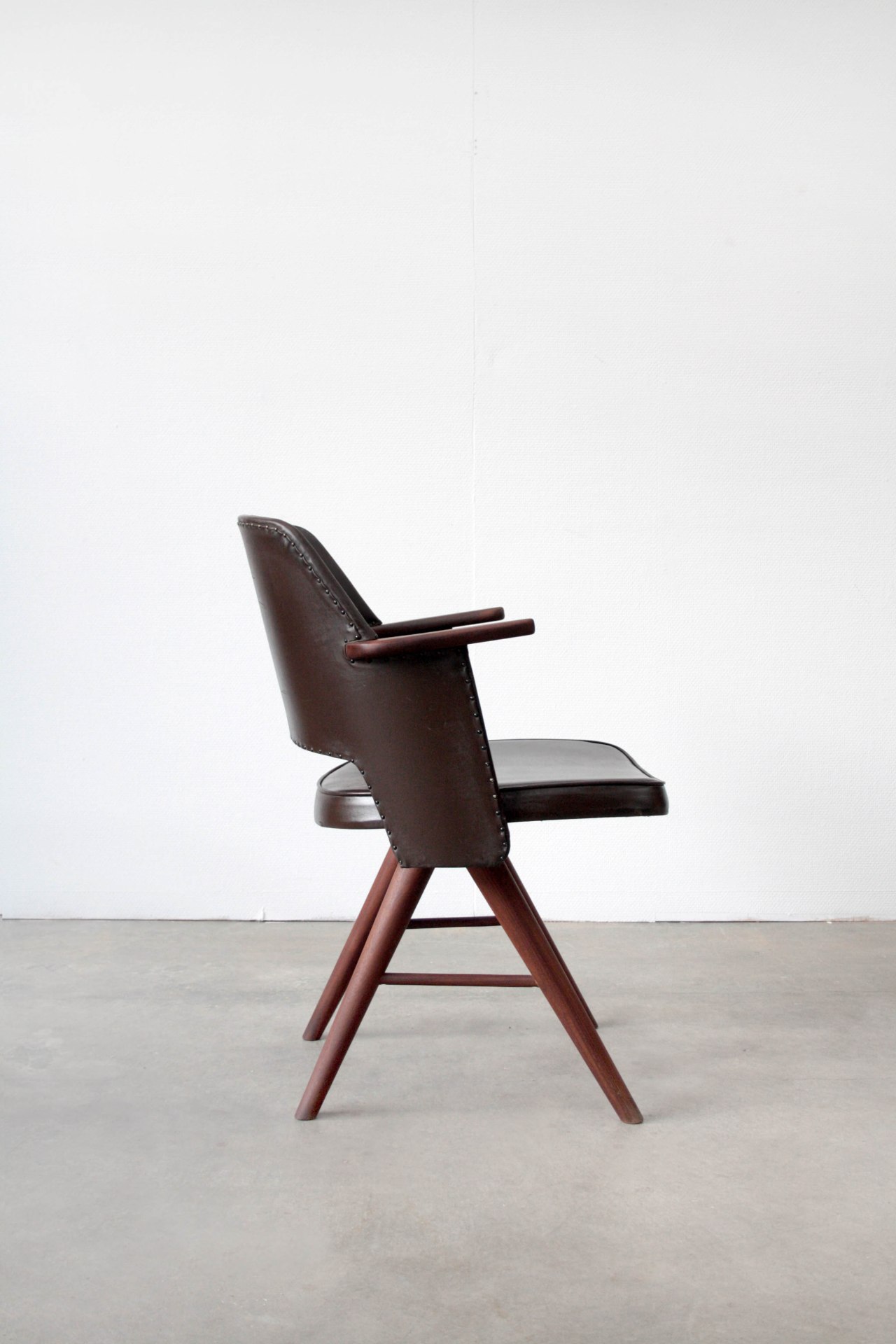 Kenmerken: Mooie teakhouten FT30 stoel van Pastoe. Deze prachtige stoel heeft een teakhouten frame en nog de orginele bruin skai lederen bekleding. De totale hoogte van de stoel is 80 cm, de zithoogte 45 cm, en de diepte 48 cm.