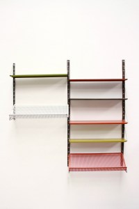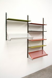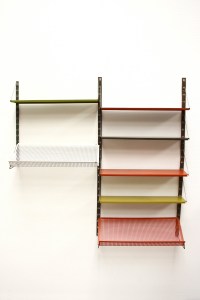 Kenmerken: Metalen industrieel design wandrek uit de jaren 50 / 60 met 5 groen / bruin metalen staanders, 14 wandbeugels en 7 planken in groen, bruin, donkerbruin en wit. Ontworpen door Tjerk Reijenga, voor Pilastro in de jaren 60. Bijzonder aan dit setje zijn de geperforeerde planken waar tijdschriften en magazines in tentoongesteld kunnen worden. De planken zijn 74 cm breed.