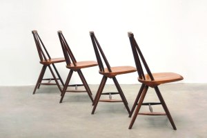 Staat: De vier massief teak houten stoelen zijn nog in zeer goede vintage staat. Een van de vier stoelen is gemerkt met een metalen Pastoe plaatje.