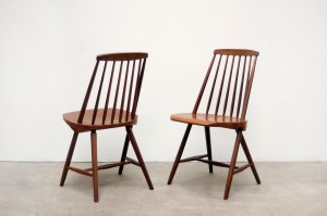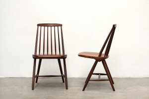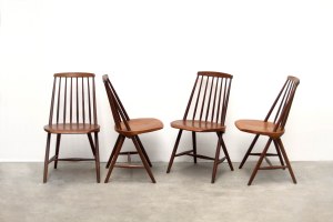 Omschrijving: Vier erg mooie SH45 spijlen stoelen van Yngve Ekström voor Pastoe. Deze spijlenstoelen zijn zeer degelijk en hebben een prachtig ontwerp met de doorlopende lijnen van rugleuning tot stoelpoot. Deze bijzondere stoelen kom je niet vaak meer tegen. De stoelen zijn van massief teakhout en in totaal 82 cm hoog.
