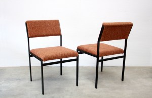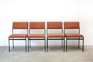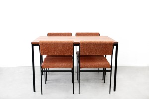 Kenmerken: Vier mooie pastoe SM07 stoelen uit de Japanse serie. Deze vier stoelen hebben een metalen frame, en grof wollen bekleding op de zitting en rugleuning. De stoelen zijn in totaal 77 cm hoog, 46 cm breed en hebben een zithoogte van 43 cm. (De tafel is verkocht).