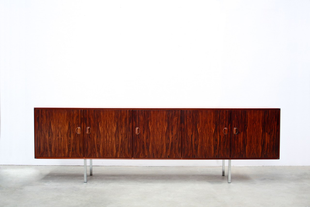 Omschrijving: Zeer mooi en imposant vintage design dressoir van Fristho. Deze kast is uitgevoerd in Rosewood en heeft chromen pootjes. Fristho staat bekend om zijn kwaliteitsmeubelen met verfijnde afwerking. Het feit dat dit dressoir er na 50 jaar nog steeds zo ontzettend mooi uit ziet is daar het bewijs van. De afmetingen zijn: 248cm breed x 46cm diep x 77cm hoog.