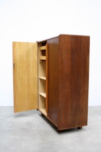 Omschrijving: Zeer mooie wandkast van Cees Braakman voor Pastoe. Dit wandmeubel is afkomstig uit de eikenserie en heeft de bekende wig vormige pootjes en de lange ronde handgrepen. Deze kast is erg mooi donker van kleur. Deze kast is bedoeld als linnenkast, maar kan ook zeker voor andere doeleinden gebruikt worden. De maten van deze design klassieker zijn: 118 X 85 X 41 cm.