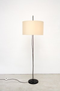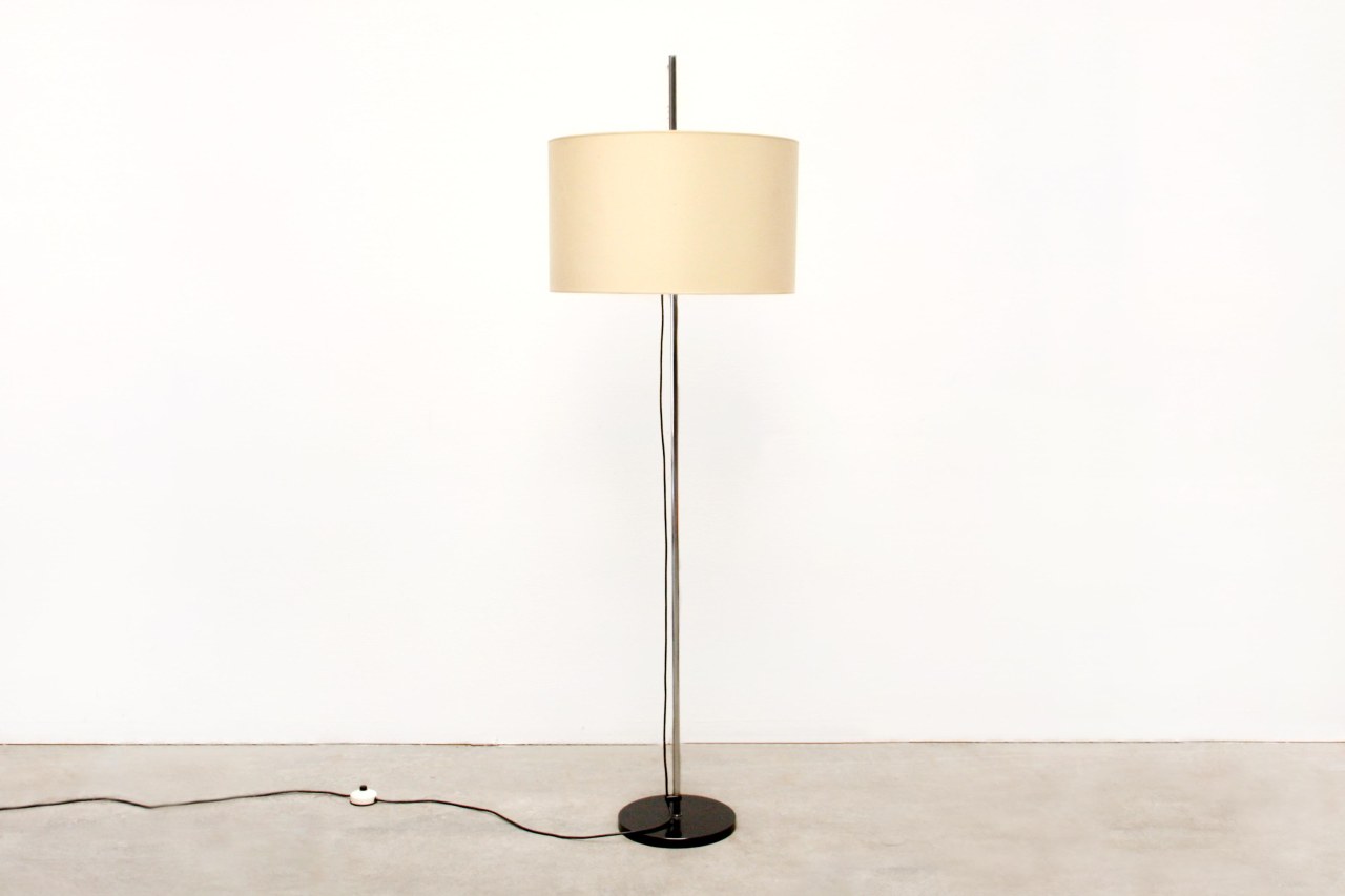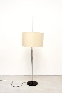Omschrijving: Zeldzame staande vloerlamp van de Duitse ontwerper Staff Leuchten. De lamp heeft een zwarte voet, chromen stang en een naturel kleurige stoffen kap die door een zeer makkelijk systeem in hoogte te verstellen is. De lamp is 161 cm hoog en de diameter van de kap is 50 cm.