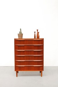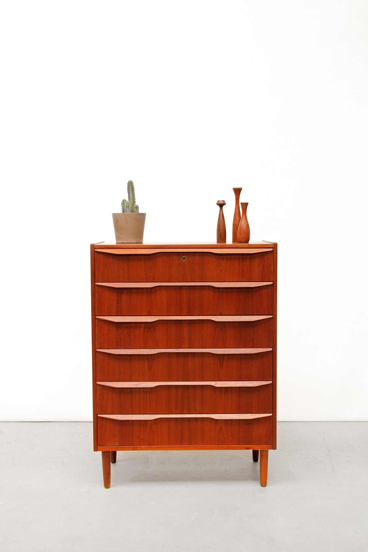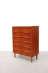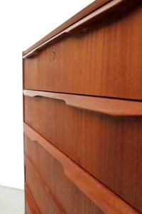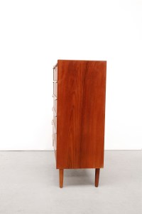 Omschrijving: Een typisch Deens design cabinet met 6 lades. Uitgevoerd in een mooie kwaliteit teak fineer en massief teak houten greepjes. Prachtig is ook de doorlopende houtnerf over de lades heen. De afmetingen zijn: 108cm hoog x 79,5cm breed x 40cm diep