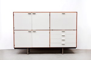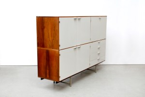 Omschrijving: Deze uit de 125M serie afkomstige Pastoe highboard is ontworpen door Cees Braakman. De kast is uitgevoerd in palissander hout en heeft wit gelakte fronten. Met de vier deurtjes, één klep en vier lades heeft deze kast erg veel opbergruimte. Het contrast tussen het palissander, witte deuren en mat nikkelen details zorgt ervoor dat deze kast een modern en strak uiterlijk heeft. De kast heeft een afmeting van: 122 cm hoog x 177 cm breed x 40 cm diep.