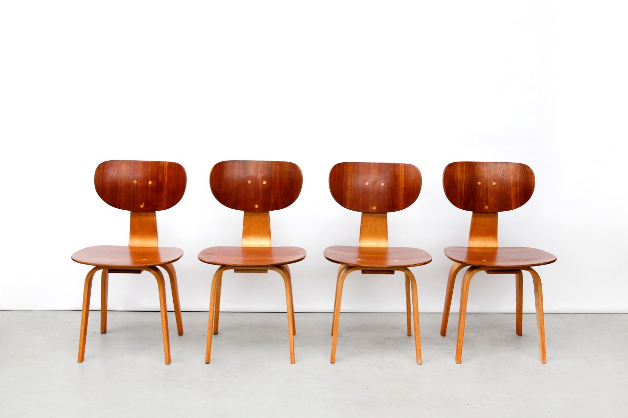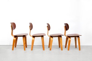Omschrijving: Vier zeer mooie vintage stoelen van de bekende ontwerper Cees Braakman voor Pastoe. Deze SB02 stoelen hebben een combinatie van Berken gefineerde poten en teak gefineerde zitting en rugleuning. Cees Braakman nam zijn inspiratie vanuit de VS (de DCW stoel van Eames) mee naar Nederland om vervolgens deze tijdloze stoelen te ontwerpen. De totale hoogte van de stoelen is 81,5 cm en de zithoogte is 45,5 cm. De breedte is 46cm en de diepte 49cm.