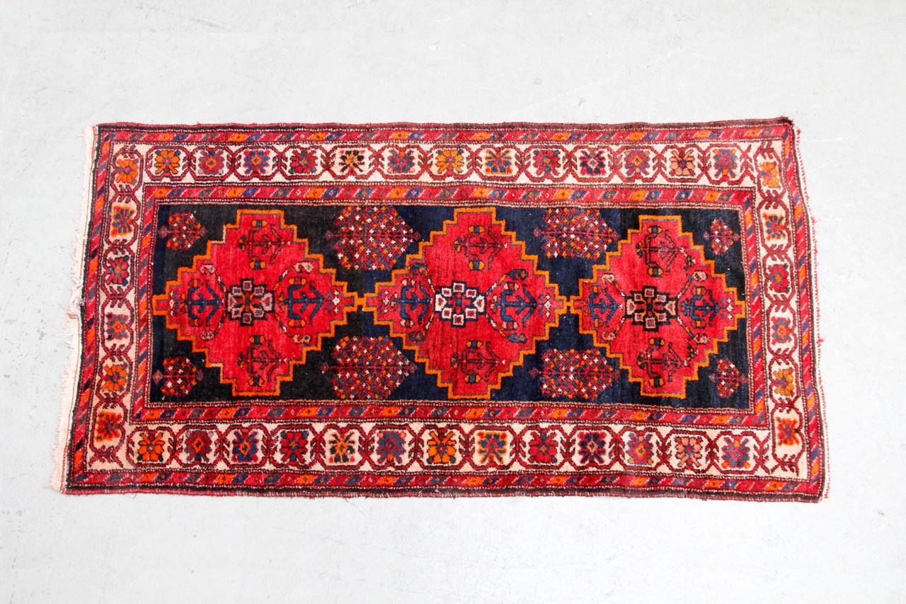 Omschrijving: Dit tapijt is een Hamadan, handgeknoopt door dorpsbewoners in noordwest Iran. De schering is van katoen en de pool van wol welke gekleurd is met natuurlijke kleurstoffen. Wanneer de wol gekleurd wordt met een pigment lijkt al het wol dezelfde kleur, maar na zoveel jaren en invloeden van buitenaf, begint het wol iets te verkleuren. De stukken die als eerste in het verfbadje zijn geweest, zien er nu anders uit dan de stukken wol die als laatste geverfd zijn. Zo zijn er in de loop der tijd kleurverschillen ontstaan. In een tapijt noemt men dat ‘Abrash’, hieraan kun je zien dat dit tapijt echt authentiek en oud is. Het tapijt is 190 bij 115 cm.