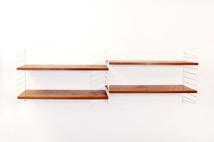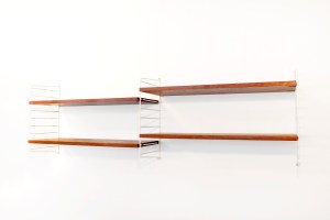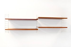 Omschrijving: Mooi String wandrekje van Nisse Strinning. Wat ooit zijn afstudeerproject was, is nu een gewild item in de moderne interieurs. Anders dan anders bij dit rekje is dat de 4 staanders wit zijn in plaats van de veel voorkomende zwarte staanders. De vier planken zijn uitgevoerd in gefineerd teak hout. Op de foto staat het rekje als een geheel afgebeeld. Het rek zou ook als twee losse rekjes opgehangen kunnen worden, d.m.v. de extra staander. De rekjes zijn 51 cm hoog. De planken zijn 78 cm breed en 30 cm diep. Zoals het rekje afgebeeld is op de foto heeft het rek een afmeting van 158,5 bij 51 cm.