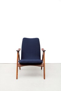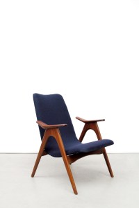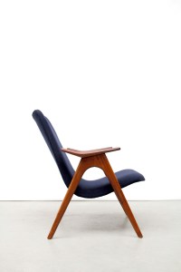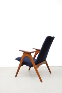 Staat: Het houtwerk heeft wat lichte gebruikerssporen, maar zeker niet opvallend. De armchair is opnieuw gestoffeerd met donkerblauwe De Ploegstof. De fauteuil is in goede vintage staat.