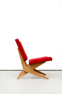 Omschrijving: Zeldzame fauteuil van Jan van Grunsven voor Pastoe. De stoel heet eigenlijk FB18, maar is omgedoopt tot de Scissor chair vanwege de kenmerkende vorm van het frame. Het is een klein maar fijn fauteuiltje uitgevoerd in Berken hout en rode Kvadrat stof.