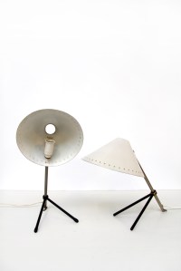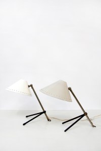 Omschrijving: Twee iconische tafel lampjes van H. Busquet voor Hala. De lampjes hebben een wit gelakte kap, en kunnen ook zeer goed als bed lampjes gebruikt worden. De twee lampjes zijn niet identiek. Het ene lampje is iets donkerder dan de andere.