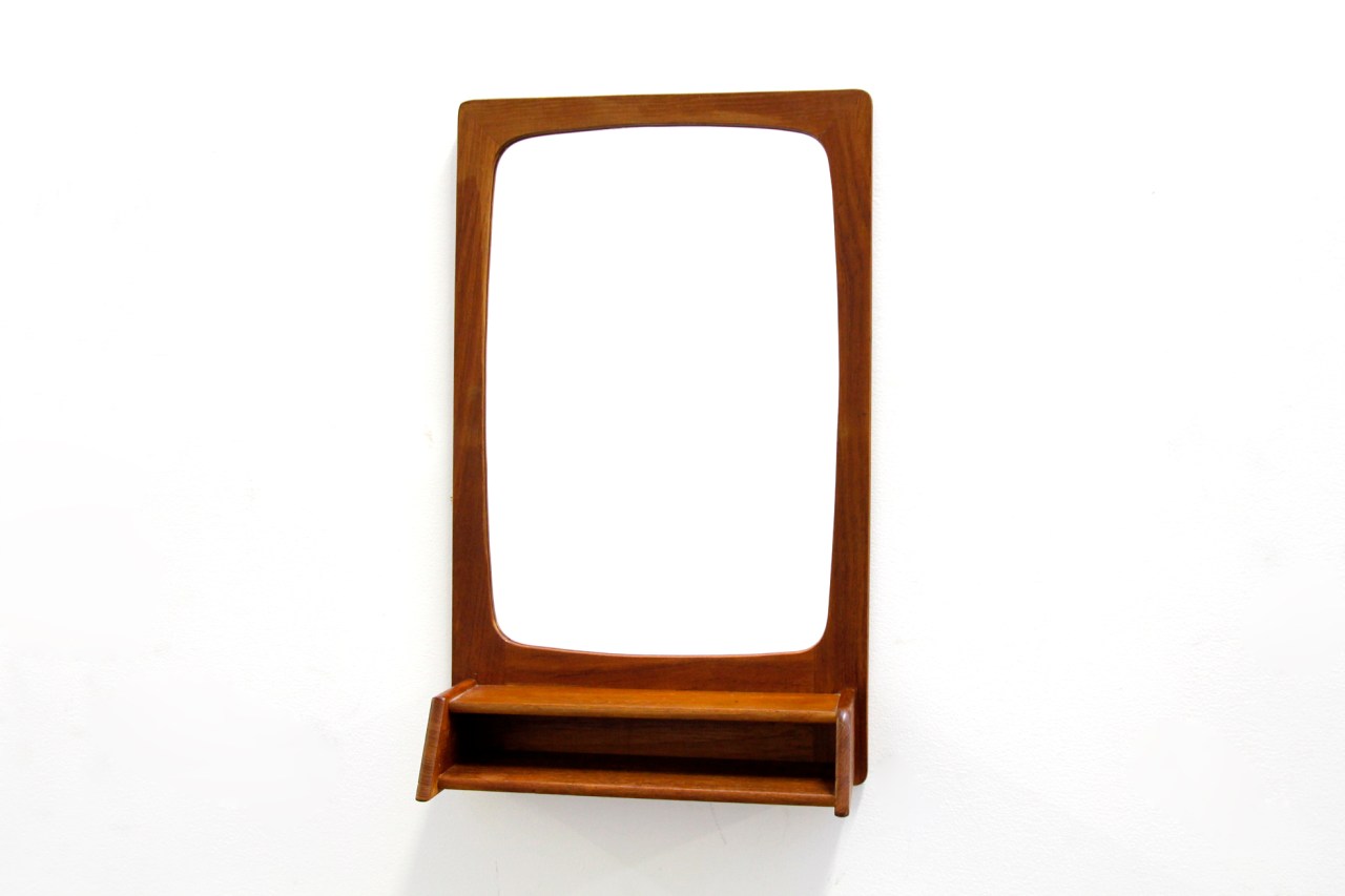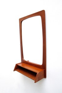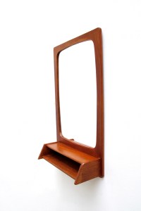 Omschrijving: Prachtige Deens design spiegel met teakhouten frame en bakje om bijvoorbeeld kam of sleutels neer te leggen. Typisch mid century modern Deens design vormgeving. Zeer leuk voor bijvoorbeeld in de gang of de slaapkamer. De spiegel is 54 bij 33 cm en met het bakje erbij 12 cm diep.