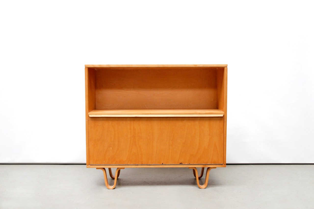 Omschrijving: Zeer leuk kastje van Cees Braakman uit de bekende Berkenserie van Pastoe. De gebogen berkenhouten poten zijn kenmerkend voor deze serie. Deze vintage design kast is klein maar fijn en te gebruiken voor vele doeleinden. Denk aan een gangkastje, een boekenkastje (voor op de kinderkamer) of als opbergruimte in de woonkamer. De kast heeft een klep en één plank en is 79 cm hoog, 88 cm breed en 30 cm diep.