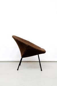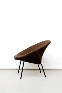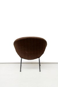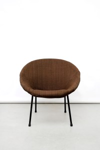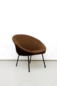 Omschrijving: Vintage mid century modern lounge chair in grof bruine stoffering en zwarte metalen poten. Dit leuke kleine fauteuiltje zit comfortabel en neemt weinig ruimte in. De fauteuil heeft een totale hoogte van 70 cm, hij is 70 cm breed en ook 70 cm diep. De zithoogte van de stoel is 40 cm.