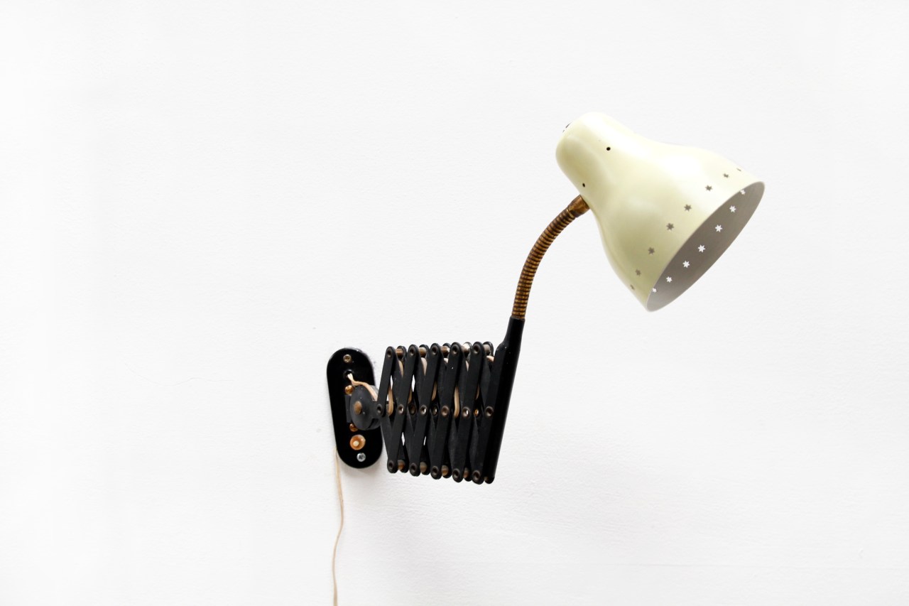 Omschrijving: Mooie vintage design schaar / harmonica lamp uit de jaren vijftig. De uittrekbare lamp heeft een zwart schaarmechanisme en een zacht gele kap met geperforeerde sterretjes . De lamp heeft een goudkleurig buigbaar tussenstuk waardoor de kap in elke gewenste richting is te stellen. De diameter van de kap is 11,5 cm en de lamp is maximaal uit te trekken tot 80 cm.