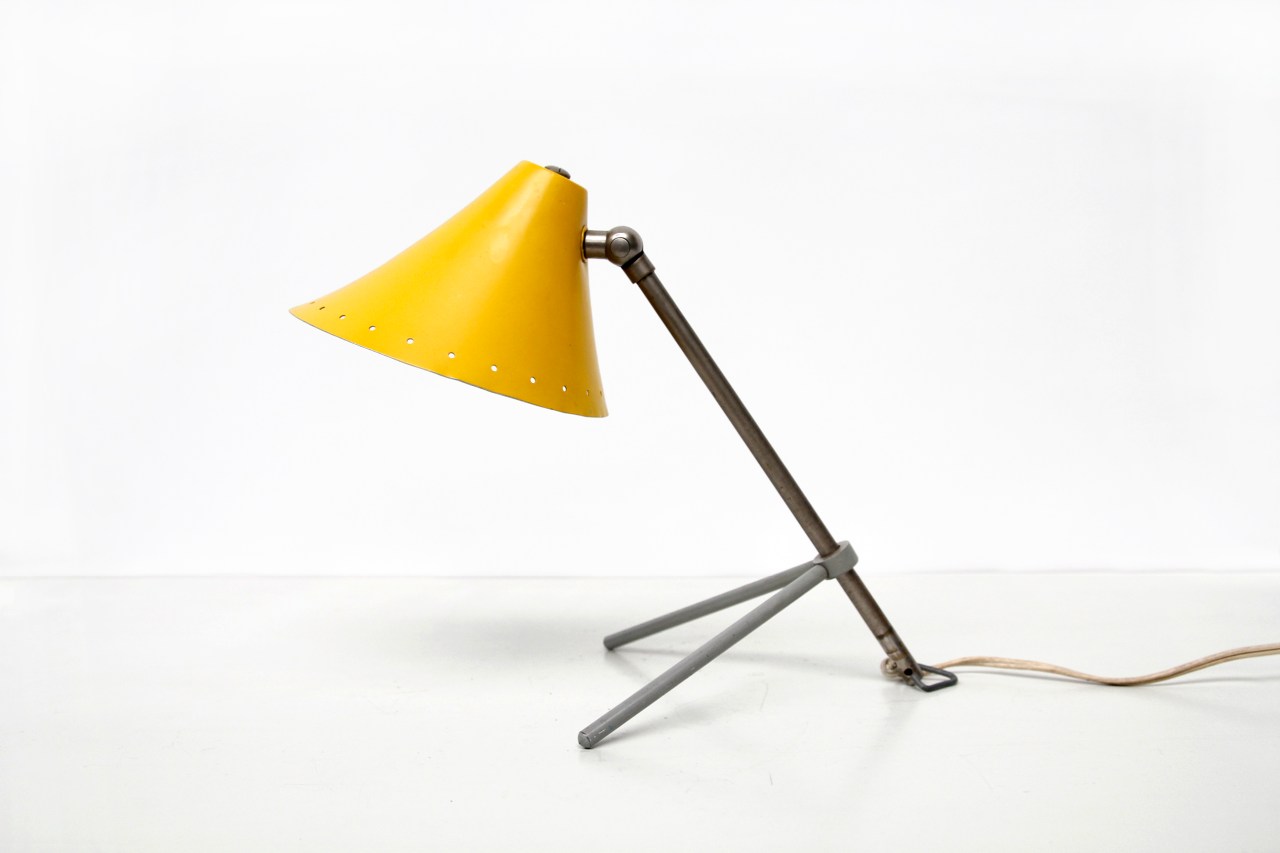 Omschrijving: Een iconisch tafel lampje van H. Busquet voor Hala. Dit lampje is ontworpen na zijn bekende zonneserie en was een groot succes. Het lampje kan in verschillende standen worden neergezet of opgehangen worden aan de muur. Hij is daarom geschikt als tafellamp maar bijvoorbeeld ook als bed lampje. De buitenzijde van het kapje is geel en de binnenzijde is wit geëmailleerd.