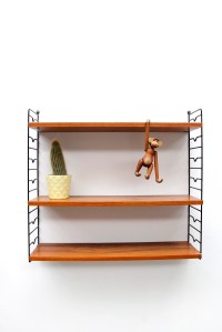 Omschrijving: Mooi String wandrekje van Nisse Strinning. Wat ooit zijn afstudeerproject was, is nu een gewild item in een modern interieur. Anders dan anders bij dit rekje is dat de staanders een hoekje hebben in het draad voor een speels effect. De drie planken zijn uitgevoerd in gefineerd teak hout. Het rekje is 72 cm hoog. De planken zijn 80 cm breed en 20 cm diep.