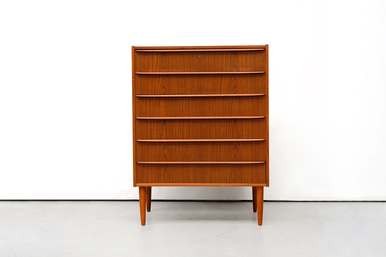 Omschrijving: Zeer mooi typisch Deens design cabinet met 6 lades. Uitgevoerd in teak fineer en massief teak houten greepjes. Erg leuke kast voor in de gang, in de woonkamer, of zelfs als commode te gebruiken. Deze kast is 104 cm hoog, 78 cm breed en 40 cm diep.