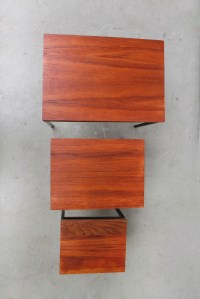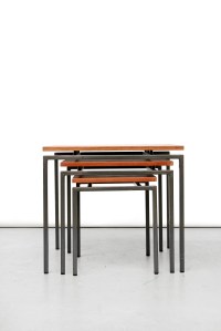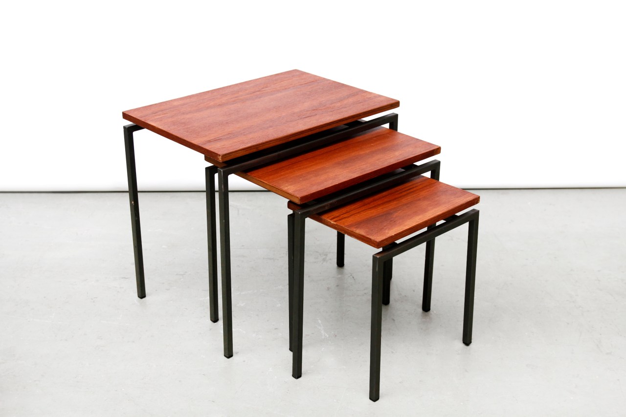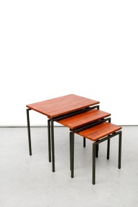 Omschrijving: Een complete vintage mimiset van Cees Braakman voor Pastoe. Door de zwevende teak houten bladen en het strakke metalen onderstel zijn het prachtige objecten in elk interieur. De grootste tafel is 45 cm hoog x 50 cm breed x 35 cm diep.