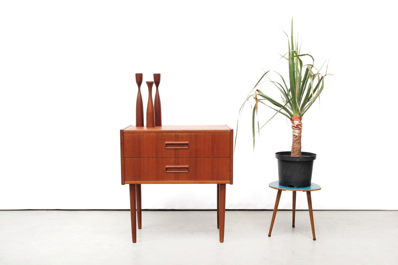 Omschrijving: Zeer mooi typisch Deens design cabinet met 2 lades. Uitgevoerd in een mooie kwaliteit teak fineer en massief teak houten greepjes. Prachtig is ook de doorlopende houtnerf over de lades heen. Door zijn formaat is dit kastje op veel plekken neer te zetten. Het Deense ladenkastje is 62 cm hoog, 58 cm breed en 33 cm diep.