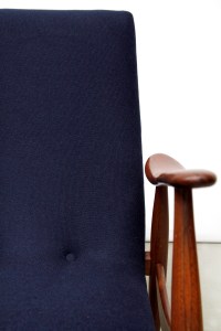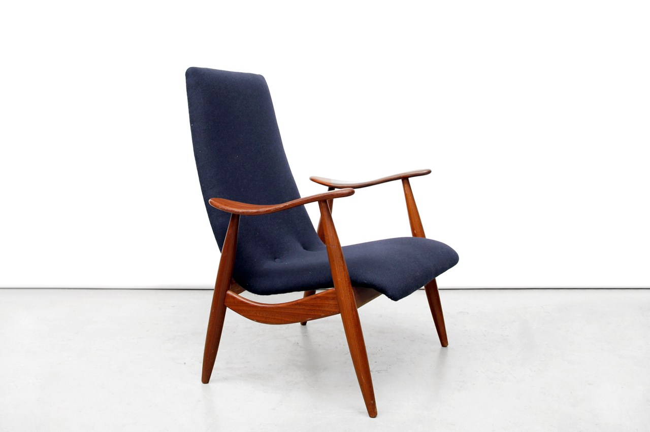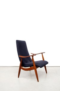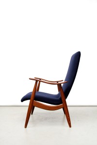 Omschrijving: Mooie design lounge stoel met een frame van teak hout en nieuw gestoffeerd met donker blauwe wollen Ploegstof. De stoel doet erg Deens aan met zijn organische vormgeving en teakhouten frame. We hebben inmiddels een paar van deze fauteuils in onze collectie gehad waardoor wij vermoeden dat deze stoelen uit Nederland komen, maar door het ontbreken van een merkje of andere documentatie weten wij dit helaas niet zeker.
