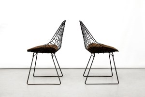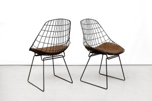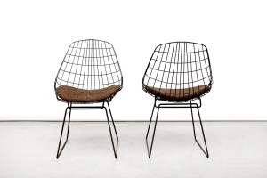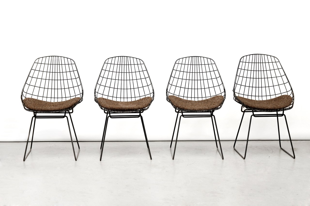 Omschrijving: Vier zwarte vintage SM05 Pastoe draadstoelen van Cees Braakman. De SM05 stoelen zijn recent weer in productie genomen, maar dit zijn nog de echte oude dining chairs met originele bruin gemêleerde kussentjes. Cees Braakman ontwierp deze stoelen geïnspireerd op de draadstoelen van Eames en Bertoia en was één van de eerste in Europa die stoelen ontwierp geheel van draadstaal. Naast dat de stoelen erg mooi zijn, zijn ze ook nog eens zeer comfortabel, licht en sterk. De stoelen hebben een totale hoogte van 82 cm, een breedte van 52 cm, een diepte van 52 cm en een zithoogte van 41 cm.