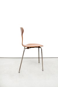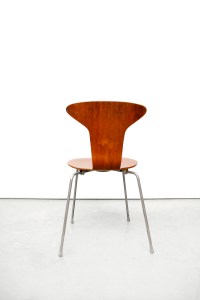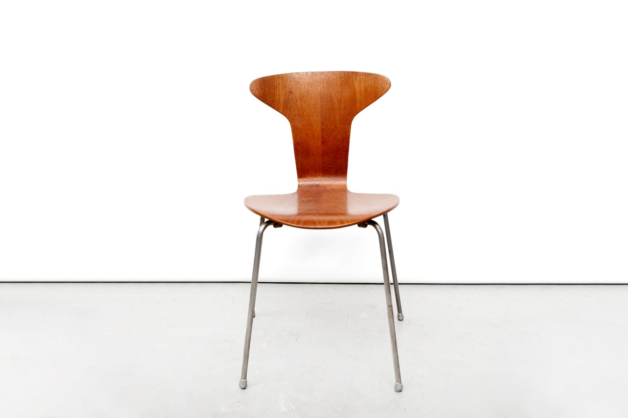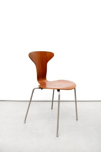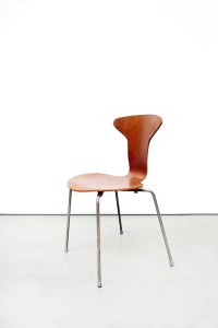Omschrijving: Een erg fraaie teakhouten Mosquito stoel van Arne Jacobsen. Oorspronkelijk heette de stoel 3105, maar hij kreeg al snel de bijnaam Mosquito, oftewel Mug in het Nederlands. Deze stoel in het bijzonder is een vroeg model uit de jaren 50 met een metalen afdekplaat gemerkt FH Danmark. Deze Mug stoelen worden niet meer geproduceerd.