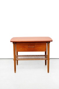 Omschrijving: Leuk Deens design bijzetafeltje in de stijl van Hans Wegner. Origineel waarschijnlijk bedoeld als telefoontafeltje of naaitafeltje gezien het speciale vak in de lade. Gemaakt van teakhout en pitriet voor bijvoorbeeld het bewaren van magazines. Het tafeltje is 60 cm breed, 47 cm hoog en 40 cm diep.