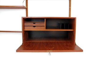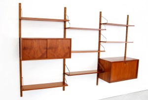 Omschrijving: Erg mooie teakhouten wandsysteem van Poul Cadovius voor Royal System uit Denemarken. Deze wandkast bestaat uit 4 staanders, 7 teakhouten planken en twee kastjes.