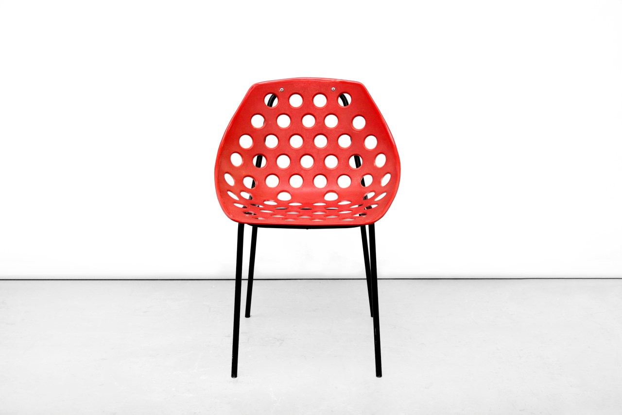 Omschrijving: Belgische klassieker van de ontwerper Pierre Guariche. Deze Franse ontwerper ontwierp voor Meurop in België en deze stoel is niet meer weg te denken uit het Belgisch Design. De frisse rode kleur en het simpele ontwerp maakt dit stoeltje geschikt voor elk interieur.