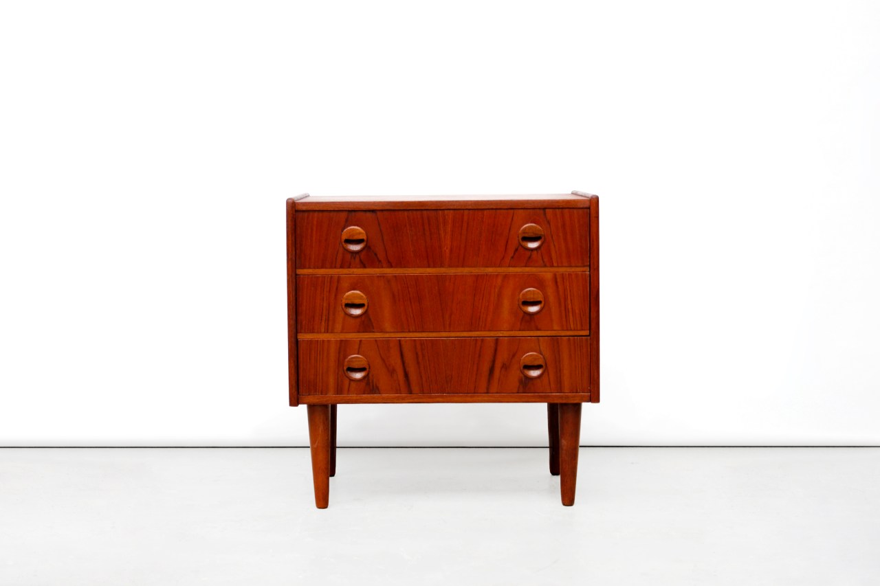 Omschrijving: Mooie ladekast uit Denemarken. De drie laden zijn gefineerd met teak met een doorlopend patroon. De ronde handgreepjes zijn gemaakt van massief teak hout. Door de typische ronde handgreepjes en het algehele ontwerp, lijkt deze kast voor ons zeer sterk op een Kai Kristiansen, de kast is helaas niet gemerkt. Deze kast is 67 cm hoog, 65 cm breed en 39 cm diep.