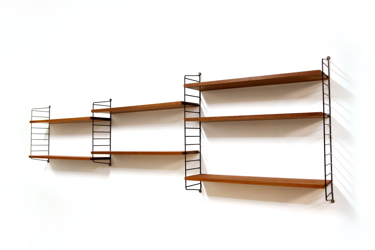 Omschrijving: Mooi String wandrek van Nisse Strinning. Wat ooit zijn afstudeerproject was, is nu een gewild item in een modern interieur. De planken zijn uitgevoerd in gefineerd teak hout. De planken zijn 80 cm breed en 20 cm diep. Op de foto staat het rekje als een geheel afgebeeld. Het rek zou ook als twee losse rekjes opgehangen kunnen worden.
