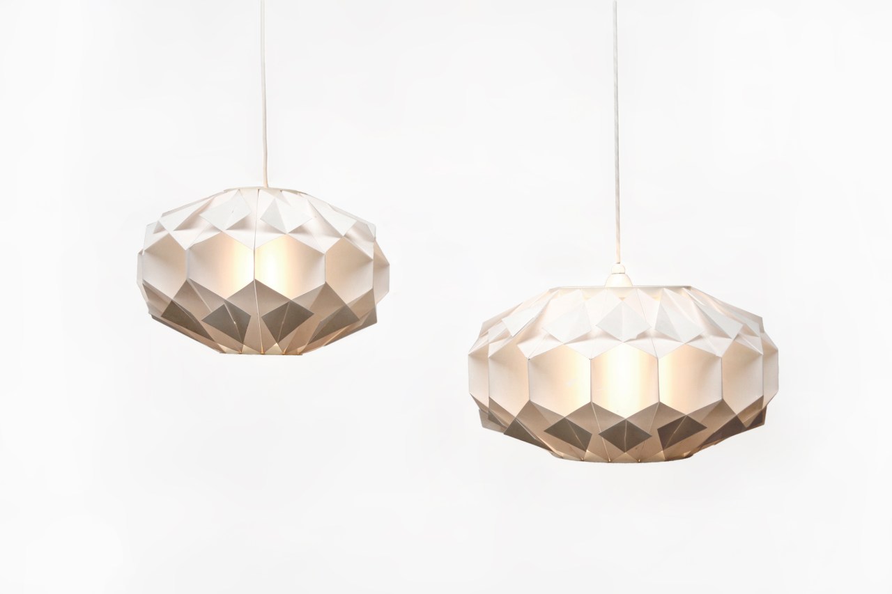 Omschrijving: Zeer mooie set van twee hanglampen van de fabrikant Hoyrup. Helaas is de ontwerper van deze lampen voor ons onbekend. De lampen zijn geïnspireerd op de oude Deense traditie van gevouwen papieren lampen van Le Klint. In de jaren zestig hebben Deense ontwerpers dezelfde traditie gebruikt maar dan met het duurzamere plastic. Deze set van twee lampen bestaat uit een grote en een kleine lamp. Allebei origineel met de oorspronkelijke armaturen en fittingen.