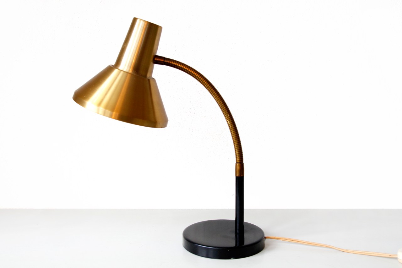 Omschrijving: Leuk goudkleurig bureaulampje. Het lampje is afkomstig uit Denemarken, maar helaas is de ontwerper onbekend.