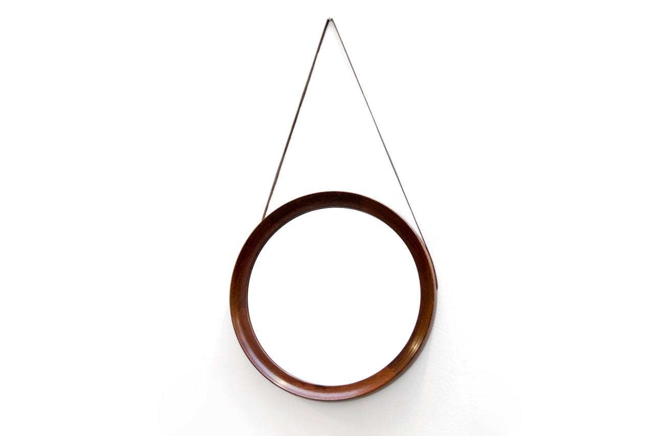 Kenmerken: Erg mooi afgewerkte en bijzondere vintage jaren 50 spiegel uit Denemarken. De spiegel is gemaakt van massief teak hout, en is op te hangen door middel van een bruin leertje. Door de diepe rand heeft de spiegel diepte als deze aan de muur hangt. Een slim en prachtig ontwerp voor een ‘plat’ object. De spiegel heeft een diameter van 39 cm en is 4 cm dik.