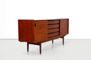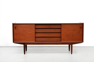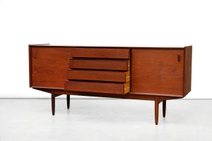 Omschrijving: Zeer mooi Deens design dressoir gemaakt van teakhout met een berkenhouten binnenkant. Het dressoir heeft mooie details zoals de teakhouten greepjes, of de uitgesneden grepen voor de lades. De kast heeft 4 lades en 2 schuifdeurtjes met daarachter twee planken.