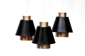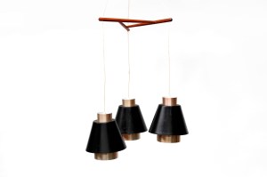 Omschrijving: Prachtige Deense design hanglamp bestaande uit 3 Jo Hammerborg stijl kelken aan een teakhouten armatuur. De kelken zijn gemaakt van aluminium en zijn gespoten in koper en zwart.