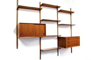 Omschrijving: Erg mooie teakhouten wandsysteem uit Denemarken. Deze wandkast bestaat uit 4 staanders, 7 teakhouten planken en twee kastjes, waarvan een ladenkast.