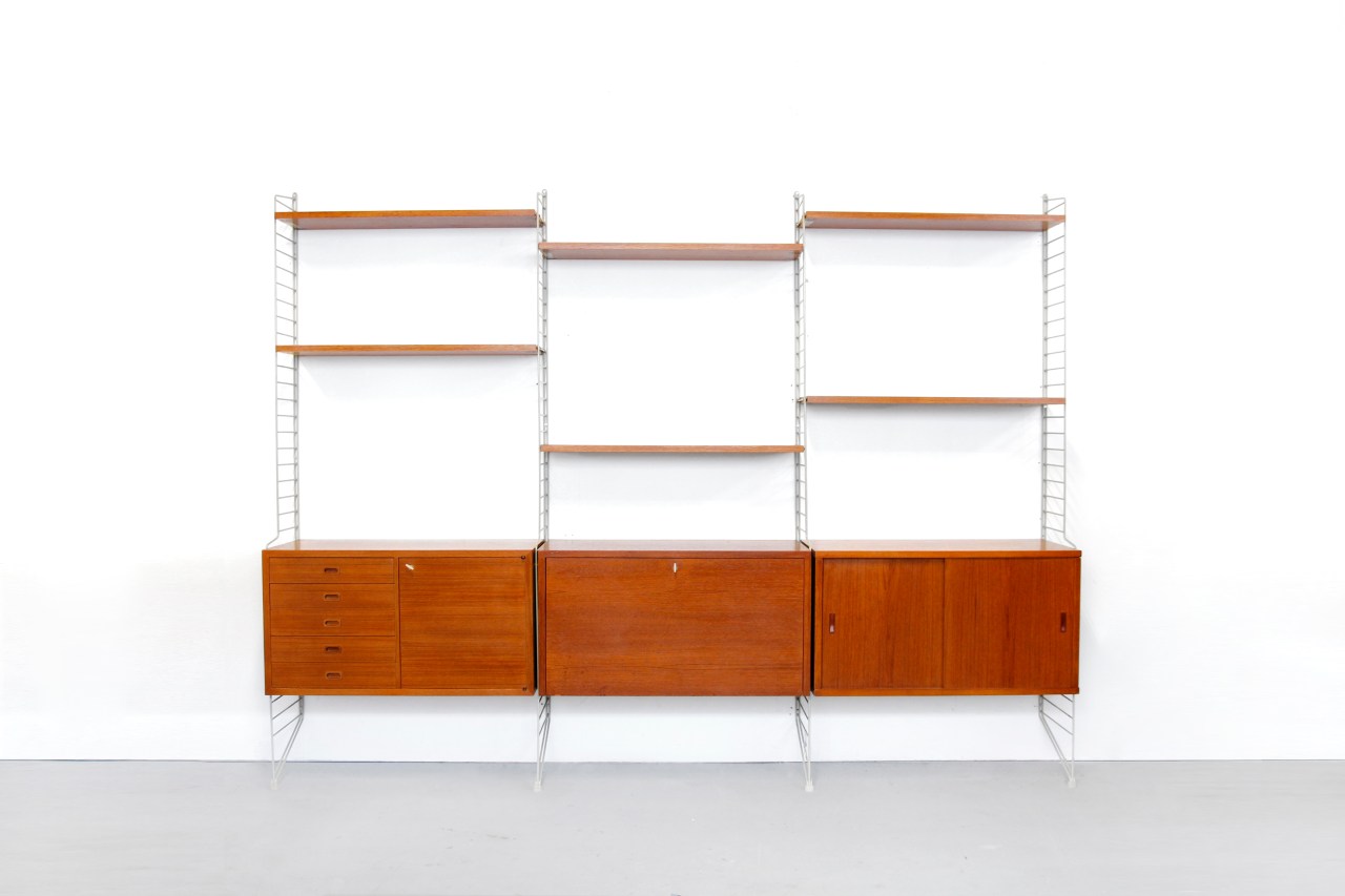 Omschrijving: Prachtig vintage String wandmeubel ontworpen door Nisse Strinning en zijn vrouw Kajsa Strinning voor String design AB. Toen Nils Nisse Strinning aan het Koninklijk Instituut voor Technologie in Stockholm studeerde ontwierp hij een afdruiprek die bestond uit geplastificeerde metalen draden. Nu niet meer uit het huishouden weg te denken, toendertijd revolutionair. Dit was het begin van de bekende string wandsysteem welke vanaf 1949 in productie ging.