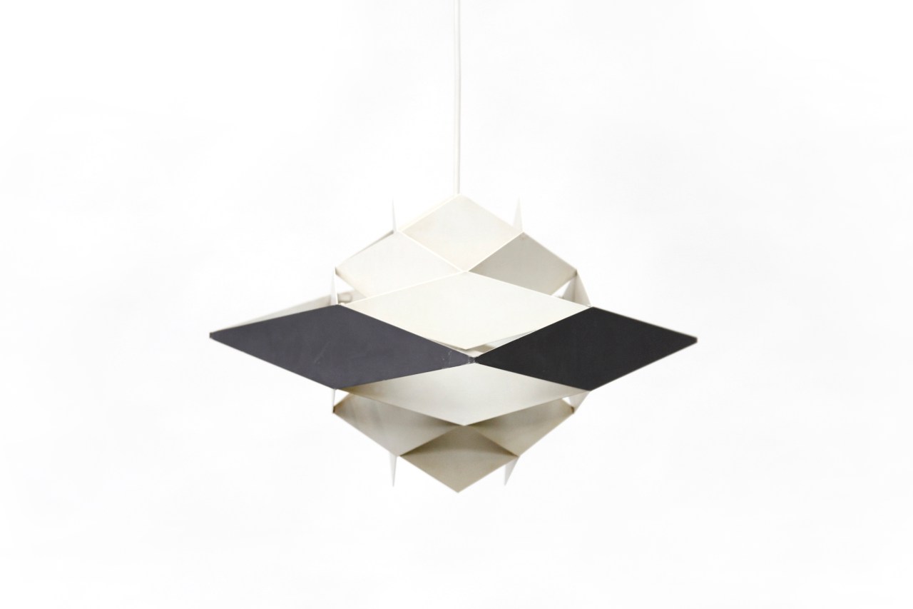 Omschrijving: Zeldzame lamp van Preben Dahl. Over deze ontwerper is erg weinig bekend, behalve dat hij een handje vol lampen heeft ontworpen. Zo ook deze hang lamp, die uit de Symfoni serie komt. De lamp is gemaakt van meerde lagen gelakt staal die in een diamant vorm gebogen zijn. Heel verfijnd is het petrol blauwe kleuraccent op de middelste laag. Hierdoor krijg de lamp een prachtige uitstraling. Dit is de kleinere variant van de lamp die we eerder verkochten. Een unieke lamp die een mooie plek verdient.
