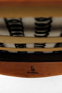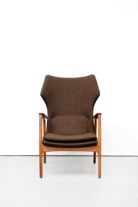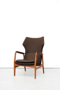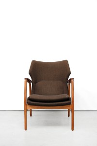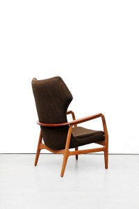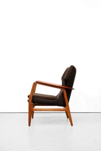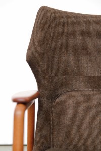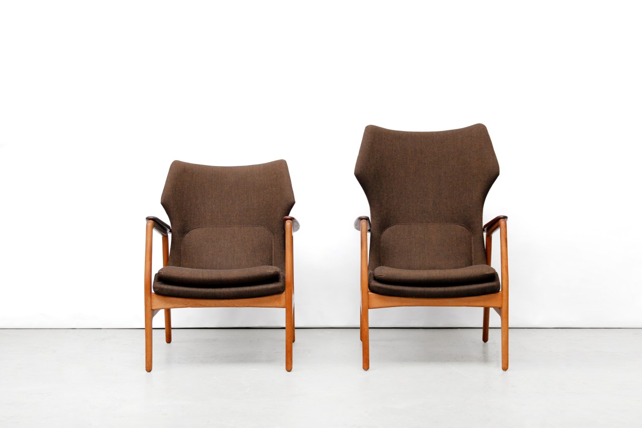 Omschrijving: Zeer mooie organische fauteuils van Bovenkamp. Hoewel Bovenkamp een Nederlands bedrijf is, werkte deze fabrikant met verschillende Deense ontwerpers. Voor deze fauteuil is samengewerkt met de Deense Aksel Bender Madsen. Vandaar dat deze fauteuils zo Deens aandoen. De set bestaat uit een lagere dames en een hoger heren model. Het frame is gemaakt van eiken hout en de doorlopende armlegger is gemaakt van teak. De lounge chair is bekleed met een bruin/zwart gemêleerde ploeg stof.