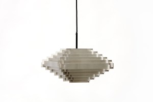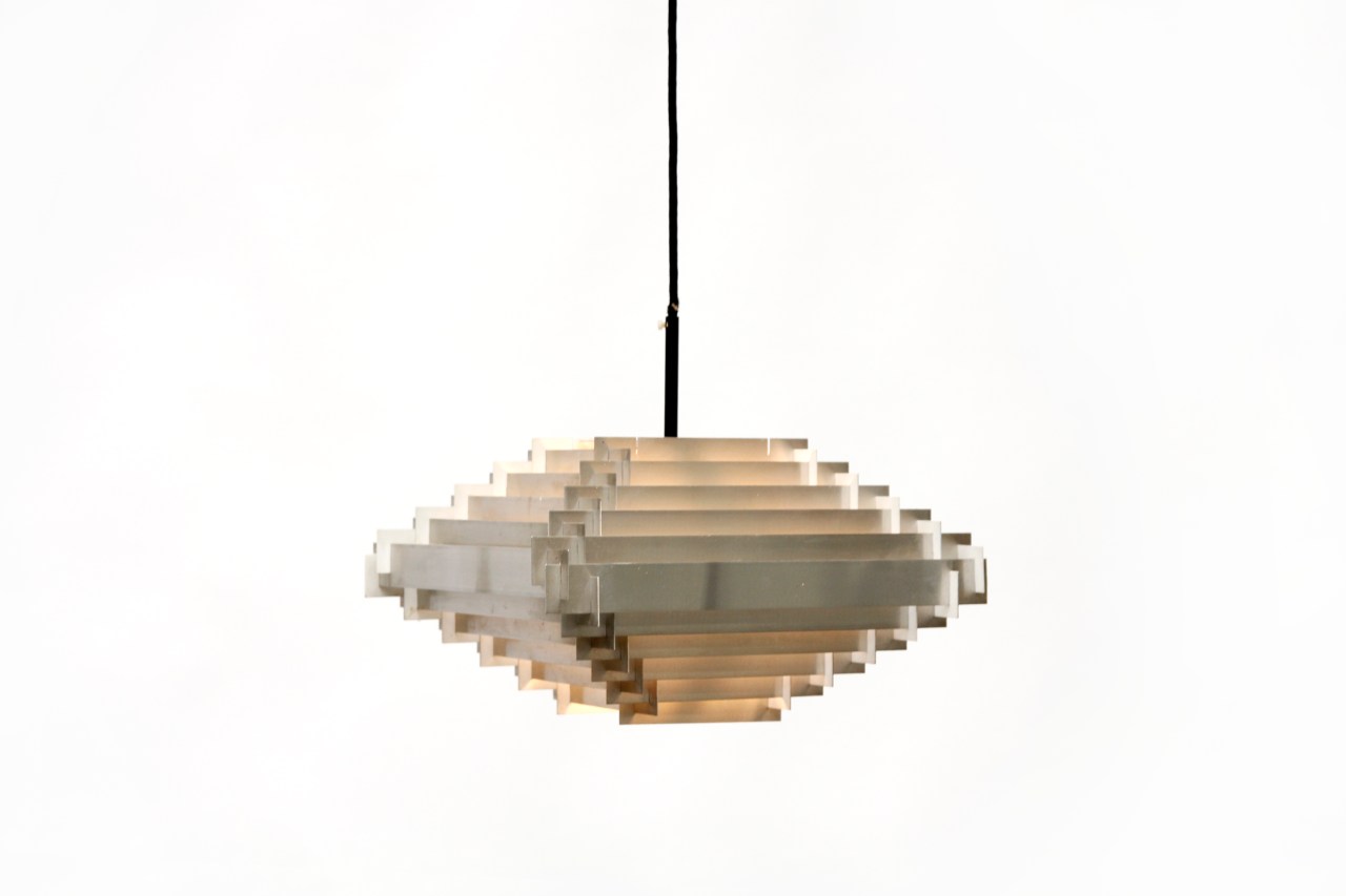 Omschrijving: Geometrische aluminium hanglamp van Fog & Mørup uit Denemarken. De ontwerper is ons helaas onbekend. Het zou goed een ontwerp van Jo Hammerborg of Hans Agne Jakobsson kunnen zijn. Desalniettemin is het een prachtige lamp met een mooie schittering.