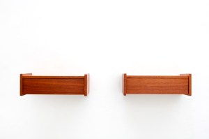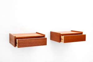 Omschrijving: Mooie set van twee zwevende nachtkastjes uit Denemarken gemaakt van teakhout. De kastjes hangen blind aan de muur en hebben beiden een lade. De nachtkastjes zijn 11,5 cm hoog, 24 cm diep en 34,5 cm breed.