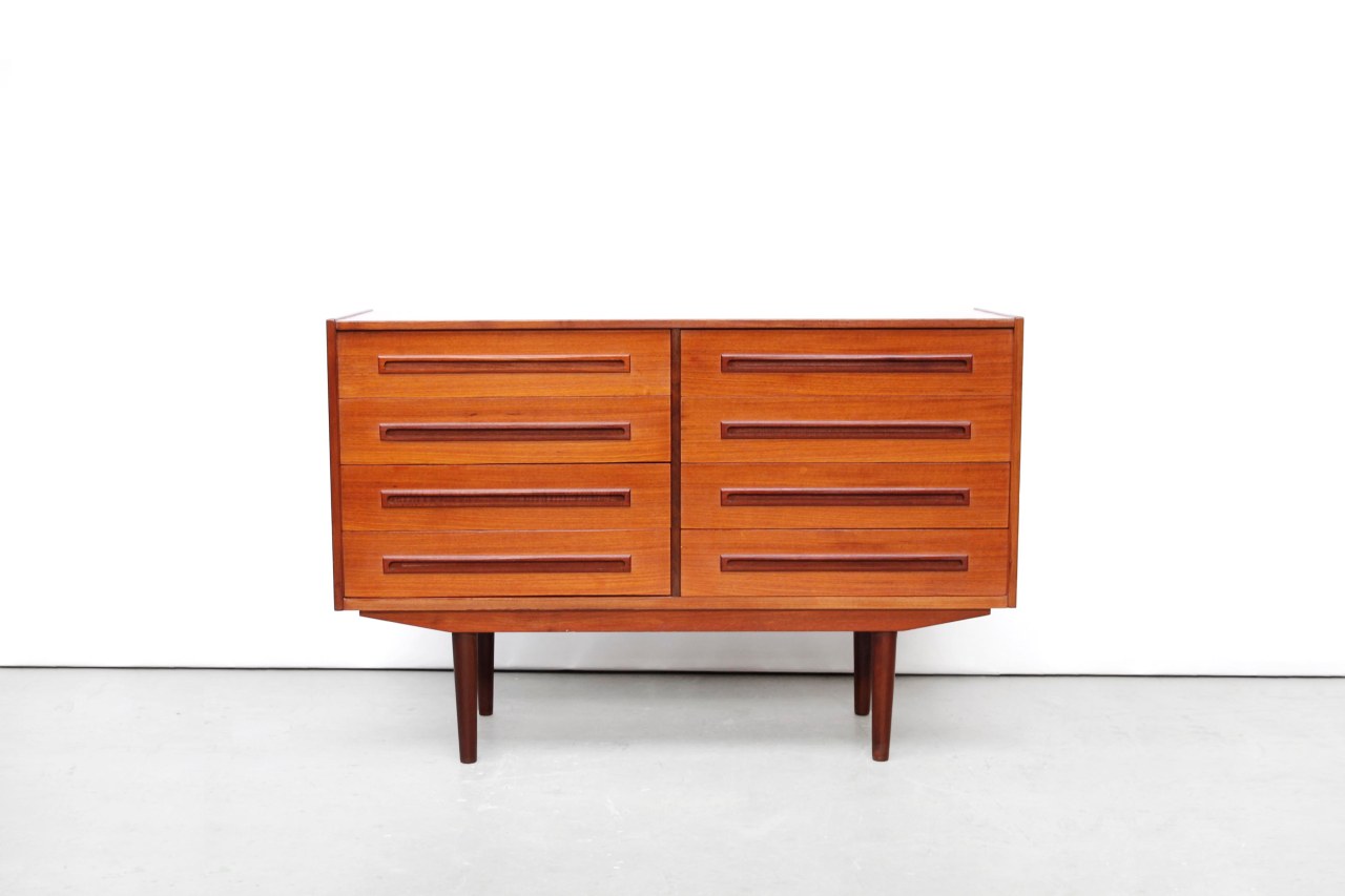Omschrijving: Zeer mooi Deens design dressoir met 8 lades. Uitgevoerd in een mooie kwaliteit teak fineer en massief palissander houten greepjes. Dit sideboard is 122 cm breed, 81,5 cm hoog en 39,5 cm diep.