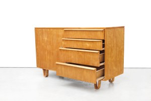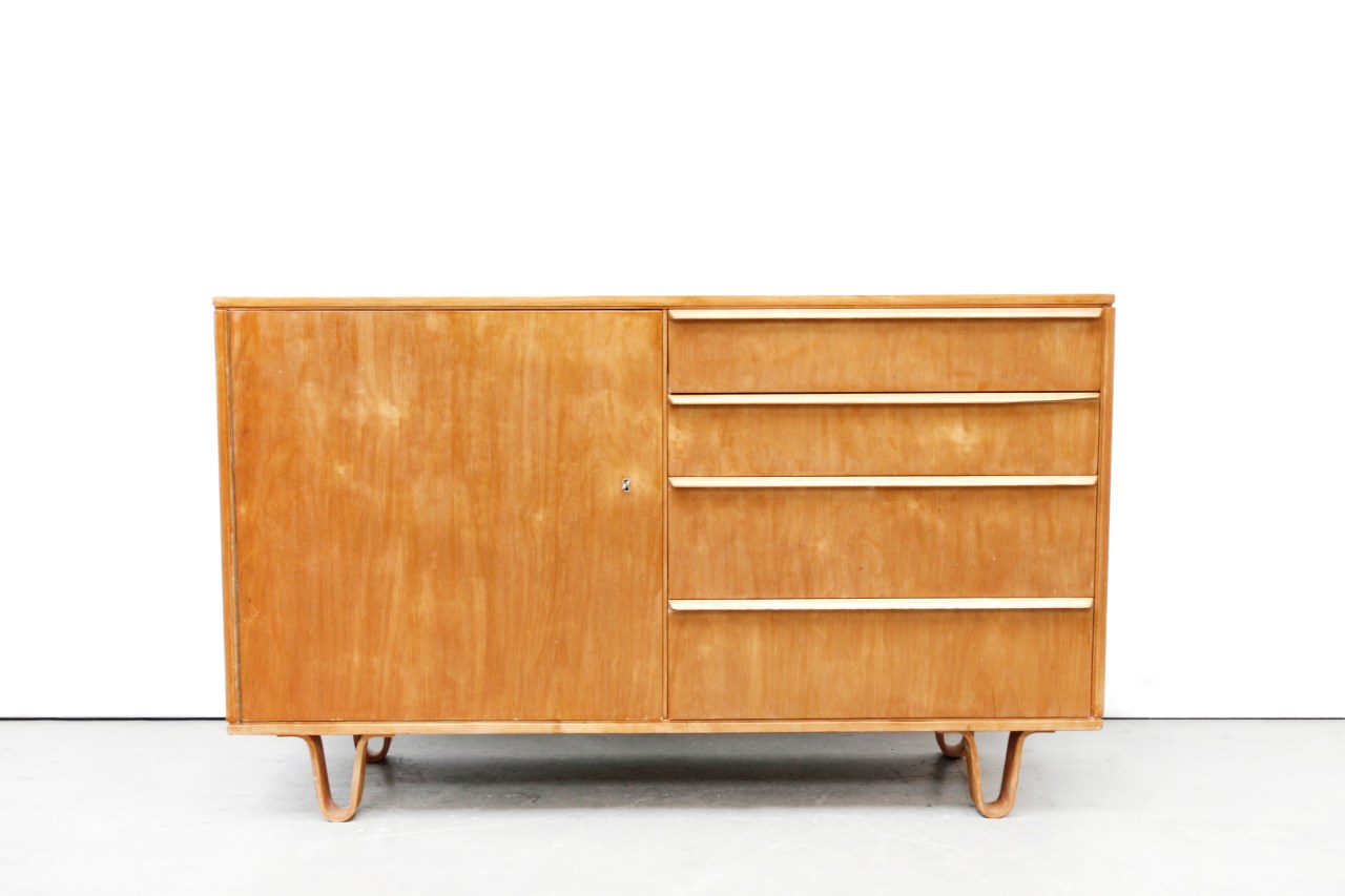 Omschrijving: Zeldzaam dressoir uit de Berkenserie van Cees Braakman voor Pastoe. Het dressoir heeft 1 deurtje en 4 lades en is volledig gemaakt van berkenhout. Iconisch zijn de bekende plywood luspoten en de gebogen anti-dust-lades. Deze DB01 kom je niet veel tegen. Het PasToe sideboard is 131 cm breed, 47,5 cm diep en 79 cm hoog.