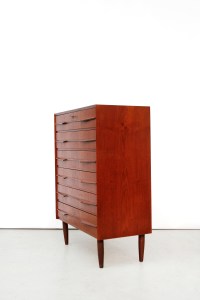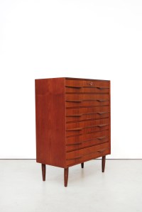 Omschrijving: Zeer mooi typisch Deens design cabinet met 6 lades. Uitgevoerd in een mooie kwaliteit teak fineer en massief teak houten greepjes. Prachtig is ook de doorlopende houtnerf over de lades heen. De afmetingen zijn: 104 cm hoog x 77,5 cm breed x 40 cm diep.