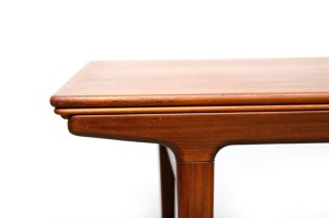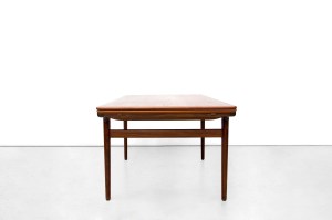 Omschrijving: Mooie grote teakhouten eetkamertafel van de Deen Johannes Andersen. De tafel heeft twee extra bladen die stijlvol verwerkt zijn onder het blad en uitschuifbaar zijn zodat er makkelijk 10 mensen aan de tafel kunnen zitten. Deze tafel is gemaakt van massief teakhout en een teak gefineerd blad. Super degelijke Deense kwaliteit en een prachtig organisch ontwerp. De tafel is 160 cm breed en met de extra bladen komt er een meter bij. De tafel is 90 cm diep en 72 cm hoog.
