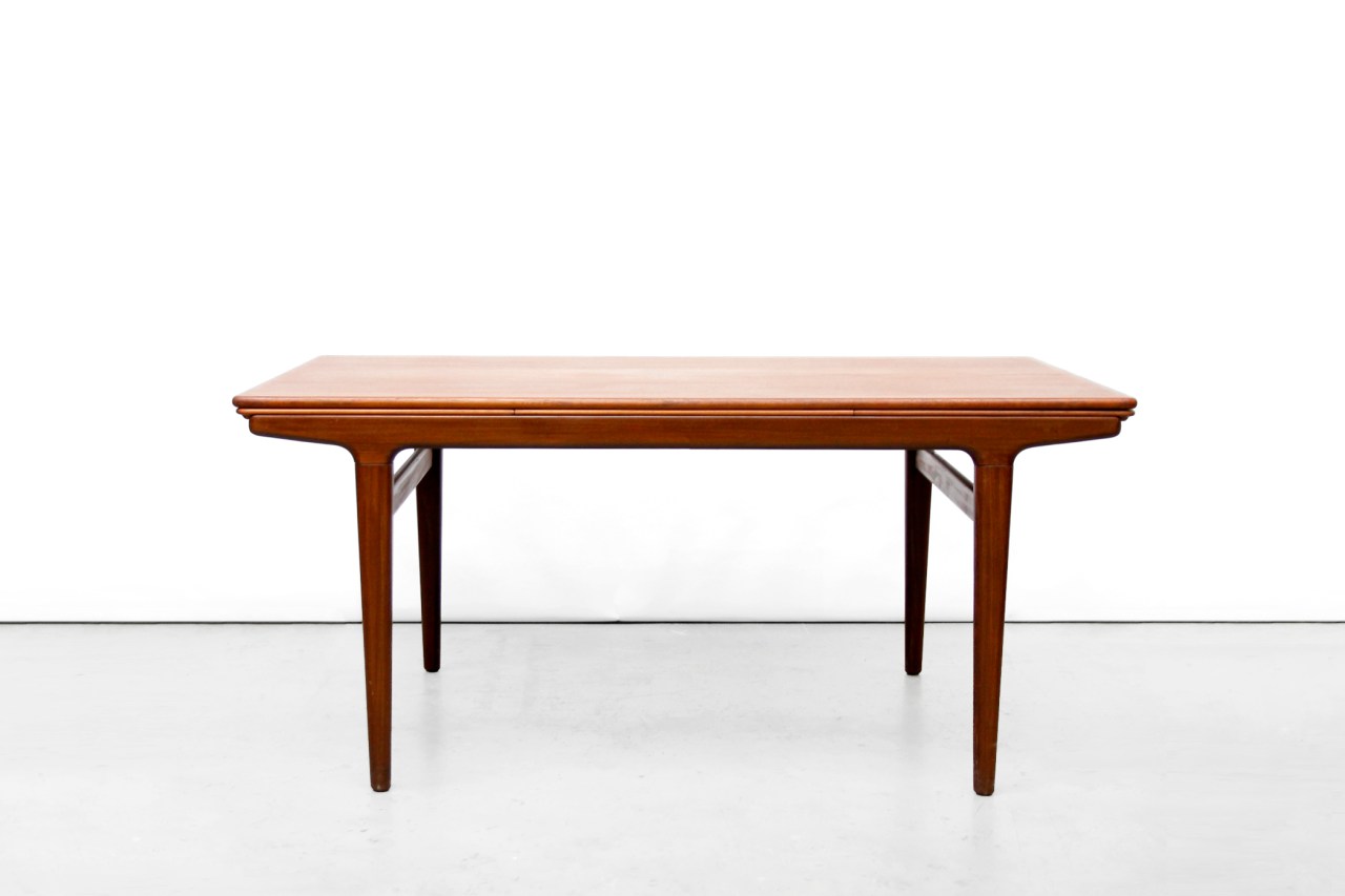 Omschrijving: Mooie grote teakhouten eetkamertafel van de Deen Johannes Andersen. De tafel heeft twee extra bladen die stijlvol verwerkt zijn onder het blad en uitschuifbaar zijn zodat er makkelijk 10 mensen aan de tafel kunnen zitten. Deze tafel is gemaakt van massief teakhout en een teak gefineerd blad. Super degelijke Deense kwaliteit en een prachtig organisch ontwerp. De tafel is 160 cm breed en met de extra bladen komt er een meter bij. De tafel is 90 cm diep en 72 cm hoog.